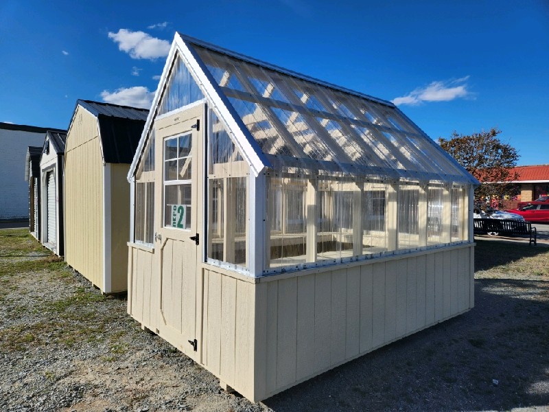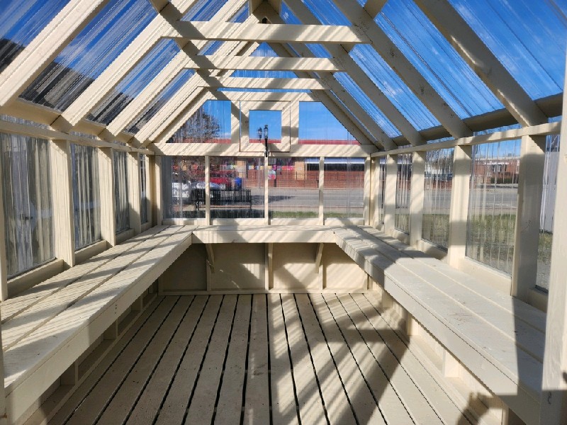 8X12 Green House with Navajo White (Stain) siding with None trim & Clear roof. Additional Options: Treated Flooring