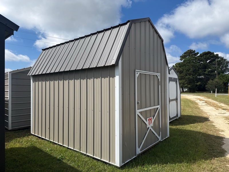 8X12 Lofted Barn with Clay siding with Barn White trim & Burnished Slate roof. Additional Options: 2×3 Window, 150 MPH Wind Rating, Vertical Metal Siding with OSB