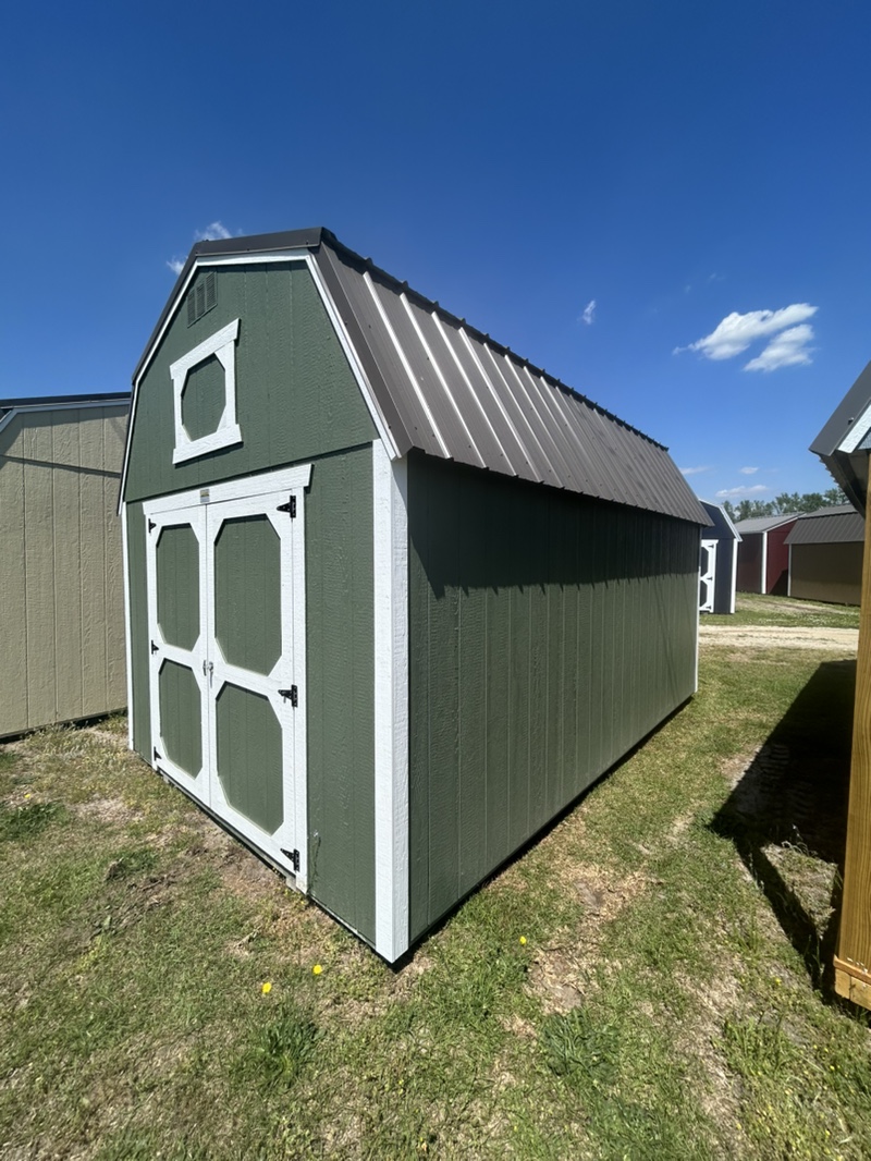 Experience the perfect blend of style, space, and efficiency with this 10 X 16 Lofted Barn available now from Hinton Buildings. This uniquely designed building by Old Hickory Buildings displays an exquisite Rosemary Green siding color that harmonizes beautifully with its Barn White trim, evoking a sense of rustic charm.