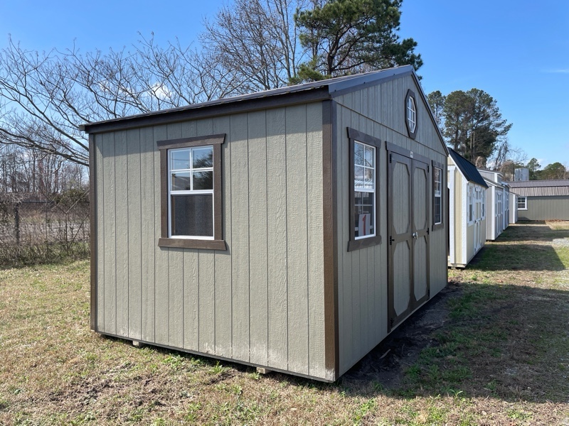 10X16 Side Gable with Hardware siding with Dark Clove trim & Burnished Slate roof. Additional Options: (4) 2×3 Window, Octagonal Window, 7′ Tall Walls, Tech Shield on Roof and Walls, Painted Trim, T&G Flooring
