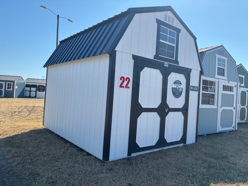 10 X 12 Lofted Barn in Barn White with Tricorn Black trim & Black roof. Rent to own from $159.46 per month.