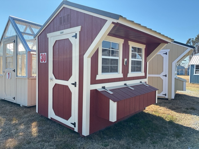 6X8 Chicken Coop with Rustic Red siding with Eaglet Beige trim & Charcoal roof. Additional Options: Painted Trim, T&G Flooring, 105 MPH Wind Rating