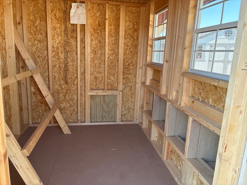 Imagine welcoming your feathered friends into a charming Rustic Red Old Hickory Chicken Coop, perfectly designed for both functionality and style. This delightful 6 x 8 building features elegant Eaglet Beige trim that beautifully contrasts with its warm wall color. The Charcoal roof adds a touch of sophistication while ensuring durability in various weather conditions.