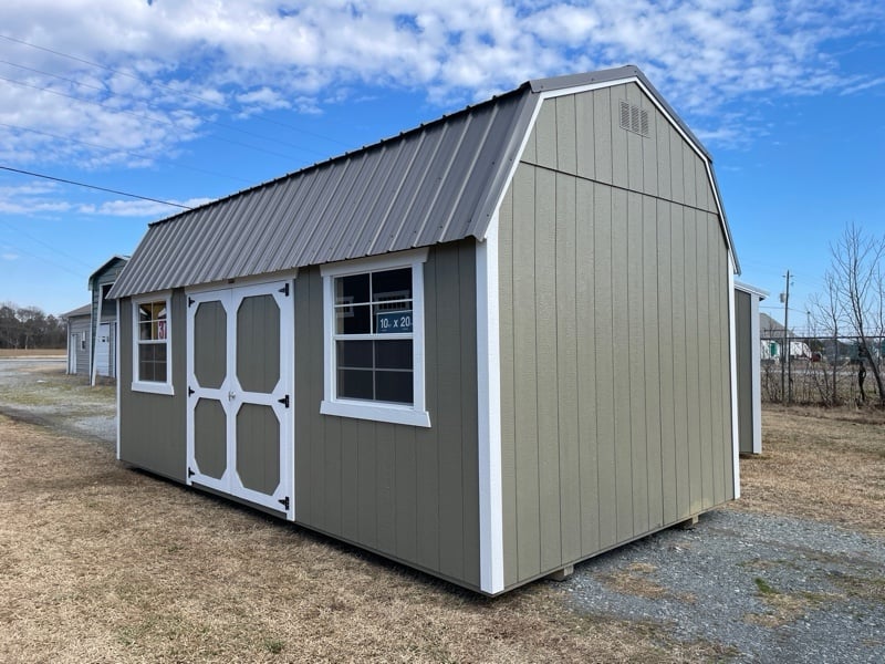 10X20 Side Lofted Barn with Hardware siding with Barn White trim & Charcoal roof. Additional Options: (2) 3×3 Window, Painted Trim, T&G Flooring